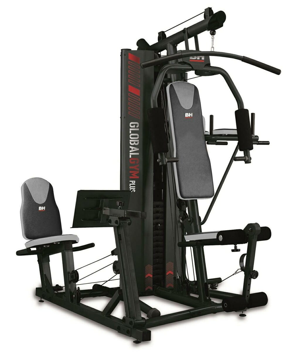 Wielofunkcyjny atlas treningowy BH Fitness z 3 stanowiskami do ćwiczeń. Główne z wyciskaniem, wyciągiem górnym i prasą do nóg jest uzupełnione suwnicą na nogi oraz poręczami do podciągania i treningu mieśni brzucha.