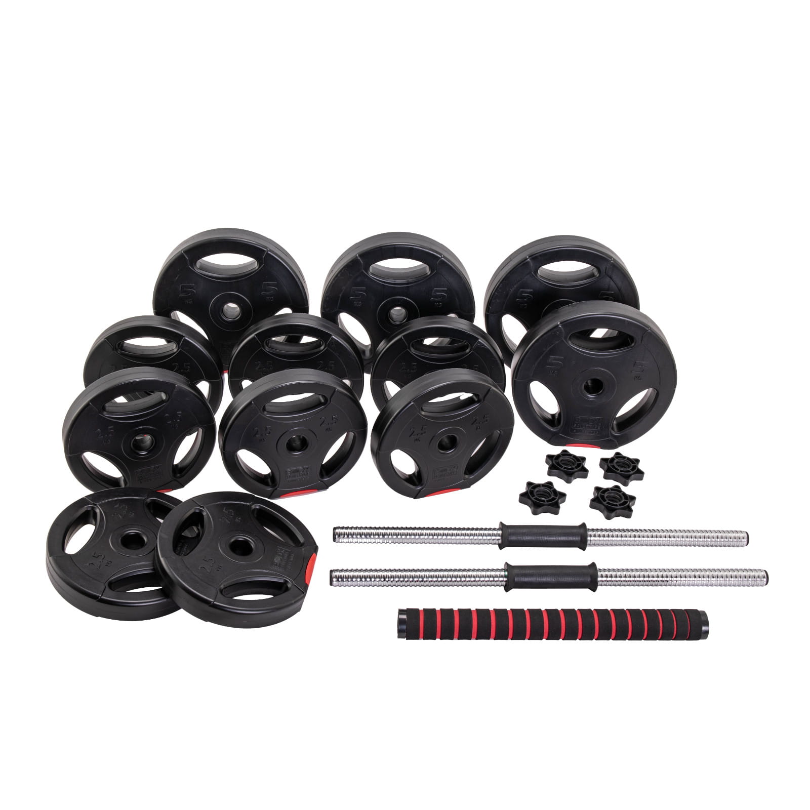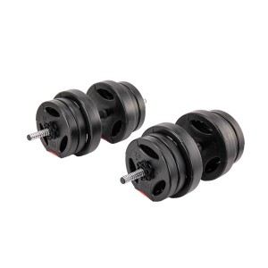 Zestaw do treningu siłowego idealny do użytku domowego. W komplecie znajdują się dwa gryfy krótkie z zaciskami, łącznik umożliwiający ich połączenie w jeden długi gryf oraz komplet 12 sztuk obciążeń o łącznej wadze 40 kg. Zestaw pozwala na różnorodne konfiguracje ciężaru, od lekkiego treningu po bardziej zaawansowane serie z większym obciążeniem.
