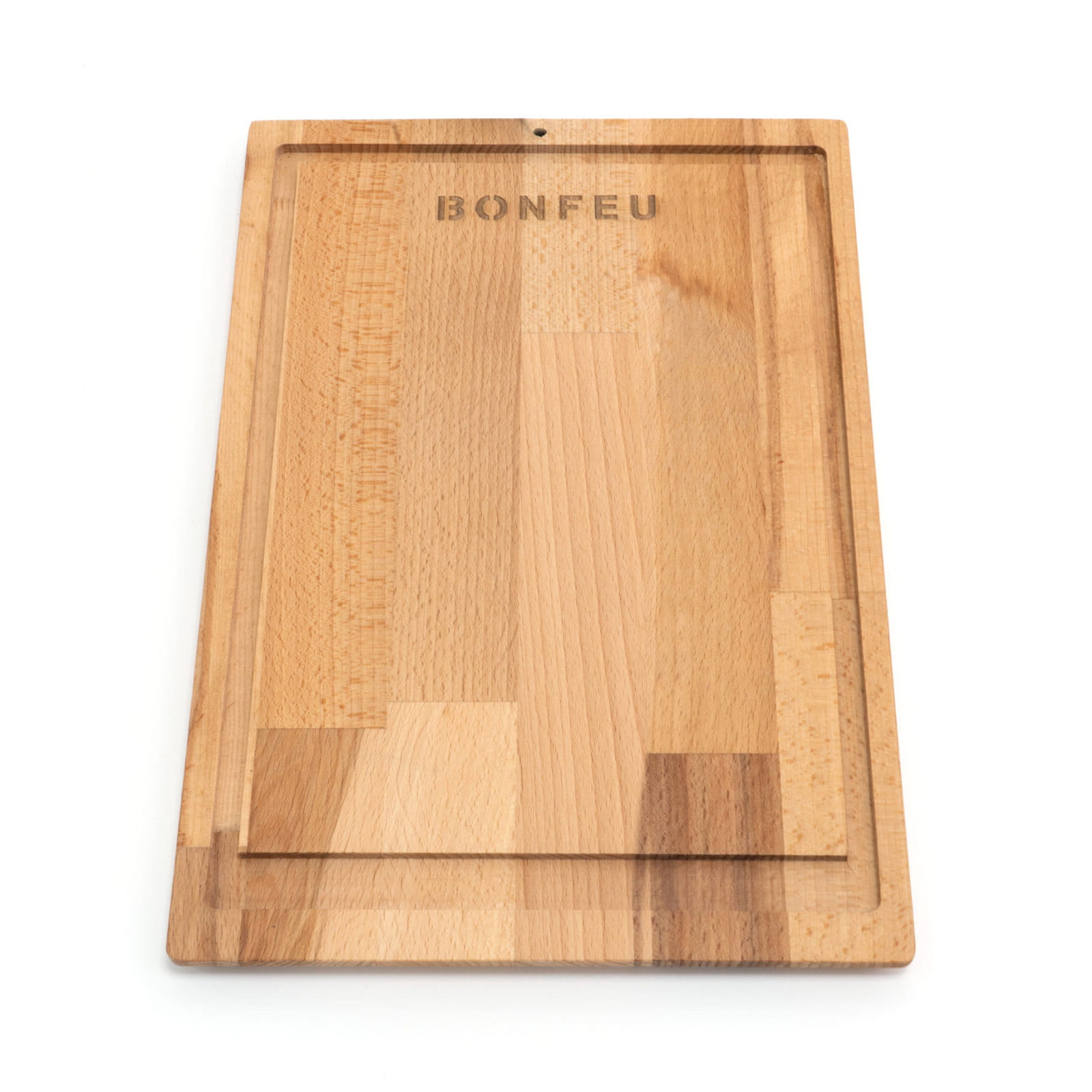 Deska wyróżnia się prostym, klasycznym kształtem i detalem w postaci wypalanego logo BonFeu, który nadaje jej wyjątkowego charakteru. Z boku znajduje się skórzana pętla umożliwiająca zawieszenie deski na haczyku, co ułatwia jej przechowywanie i sprawia, że może pełnić również funkcję dekoracyjną w kuchni lub przy strefie grillowej.