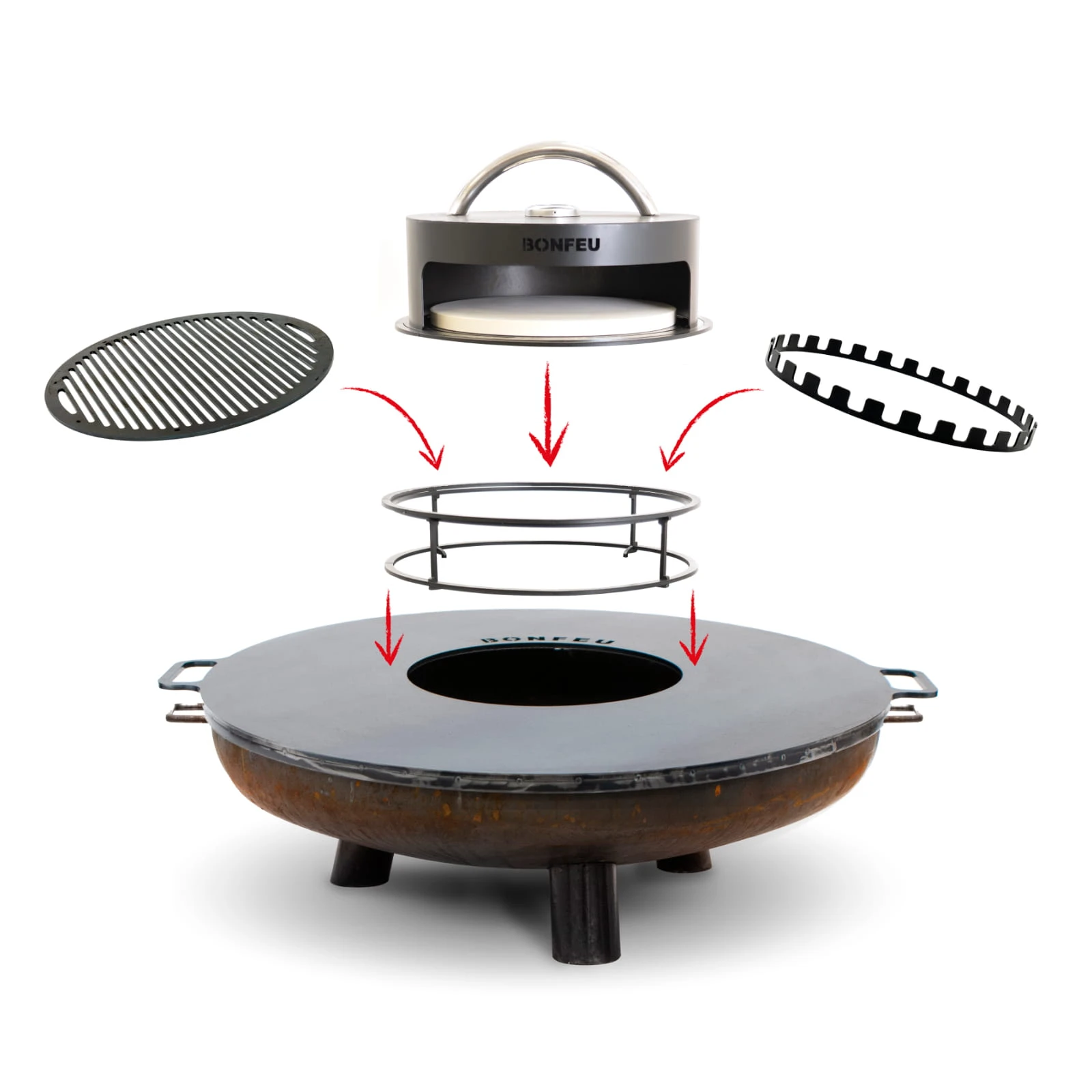 Dzięki swojemu ponadczasowemu designowi, BonBowl Plus doskonale wkomponowuje się zarówno w nowoczesne, jak i klasyczne ogrody. Ozdobne wycięte logo wyróżnia to palenisko spośród innych dostępnych na rynku, a podniesiona krawędź zapobiega wypadaniu popiołu i drewna do ogrodu, zwiększając komfort i bezpieczeństwo użytkowania.
