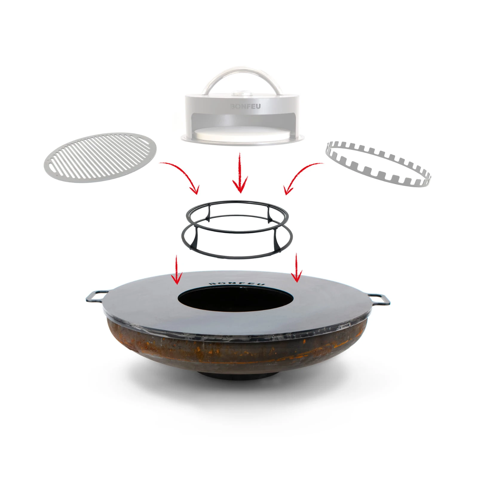 Stojak na akcesoria do BonPlanchy marki BonFeu to praktyczny dodatek, który znacznie ułatwia gotowanie na świeżym powietrzu. Łatwy do umieszczenia na kuchni zewnętrznej BonBiza lub misach ogniskowych BonBowl, stojak ten jest idealny do wykorzystania z piecem do pizzy BonPizza, pierścieniem do szaszłyków czy grillem na stojaku. Doskonale wpasowuje się w środek BonBiza i BonBowl, zapewniając stabilność podczas gotowania.