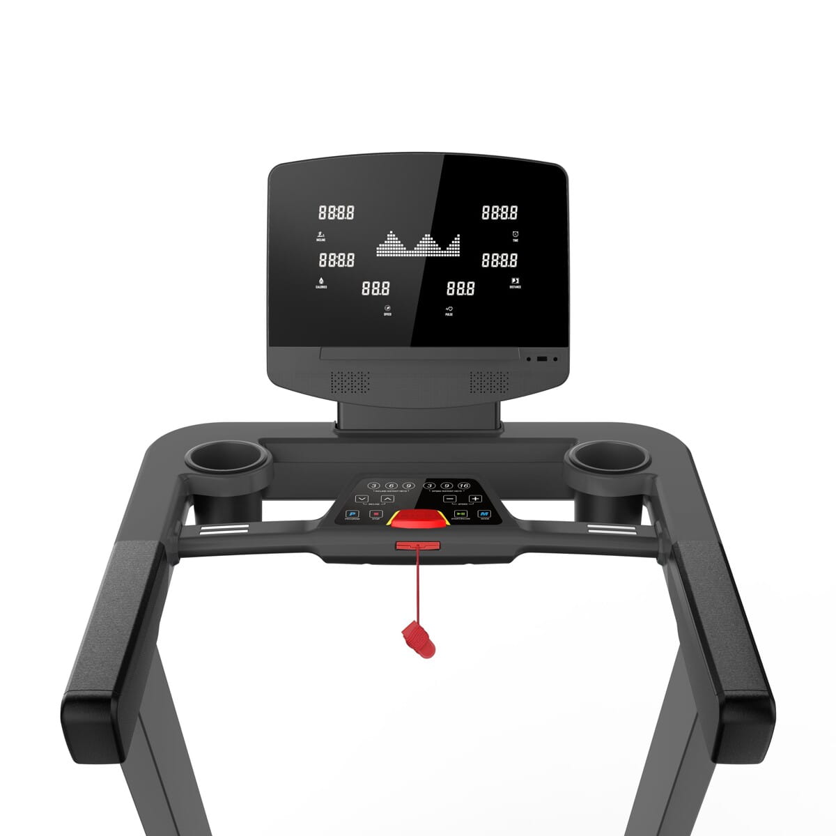 Przejrzysta konsola z 7 oknami prezentującymi: czas, dystans, kalorie, prędkość, tętno i kąt nachylenia.