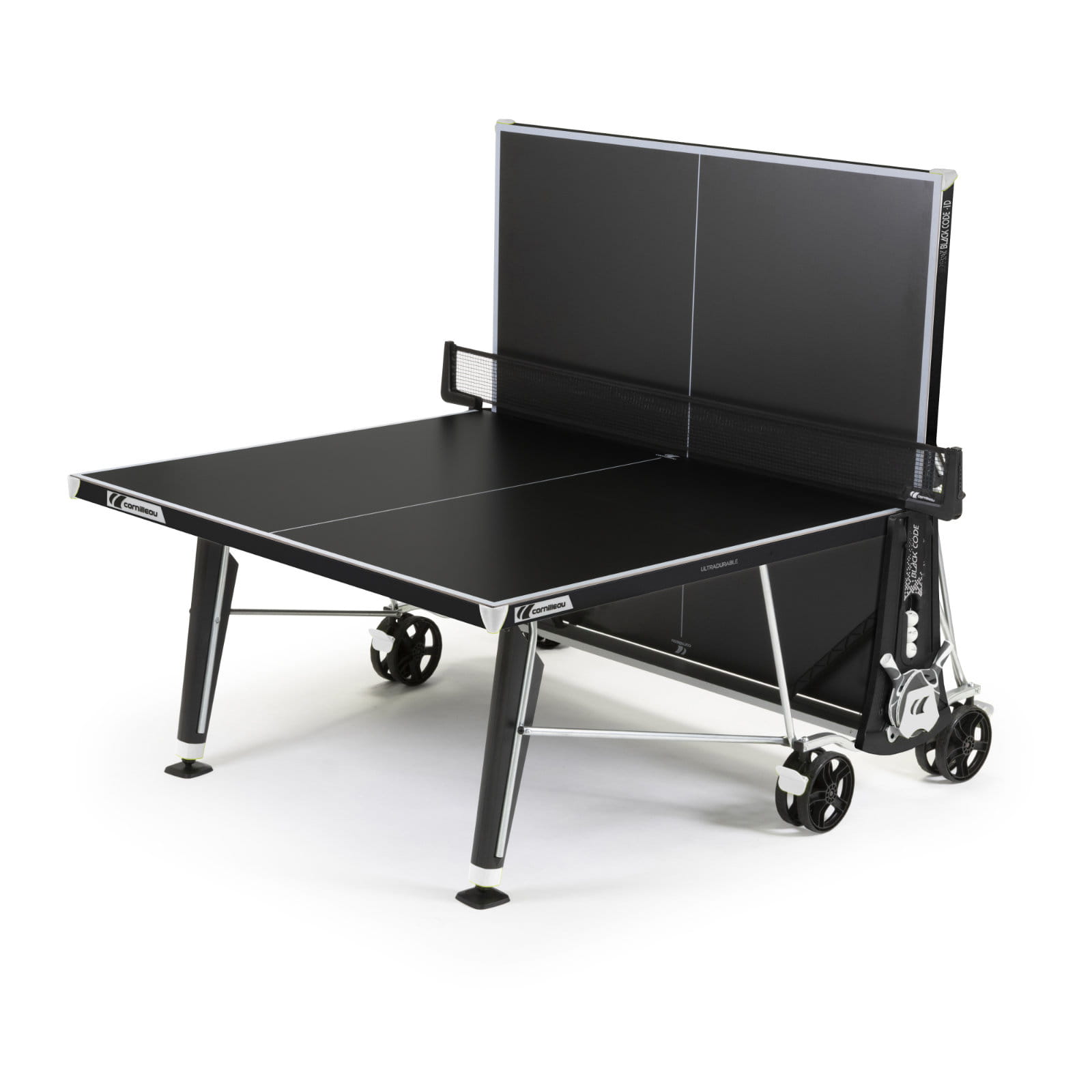 Stół tenisowy BLACK CODE to wyjątkowy stół z limitowanej serii stołów marki Cornilleau do użytku zewnętrznego. Doskonale się prezentuje, a jego wyprofilowane nogi, duże koła z hamulcami, praktyczne kieszenie do przechowywania rakietek i piłeczek, ergonomiczny system rozkładania i składania siatki to tylko niektóre zalety stołu BLACK CODE.