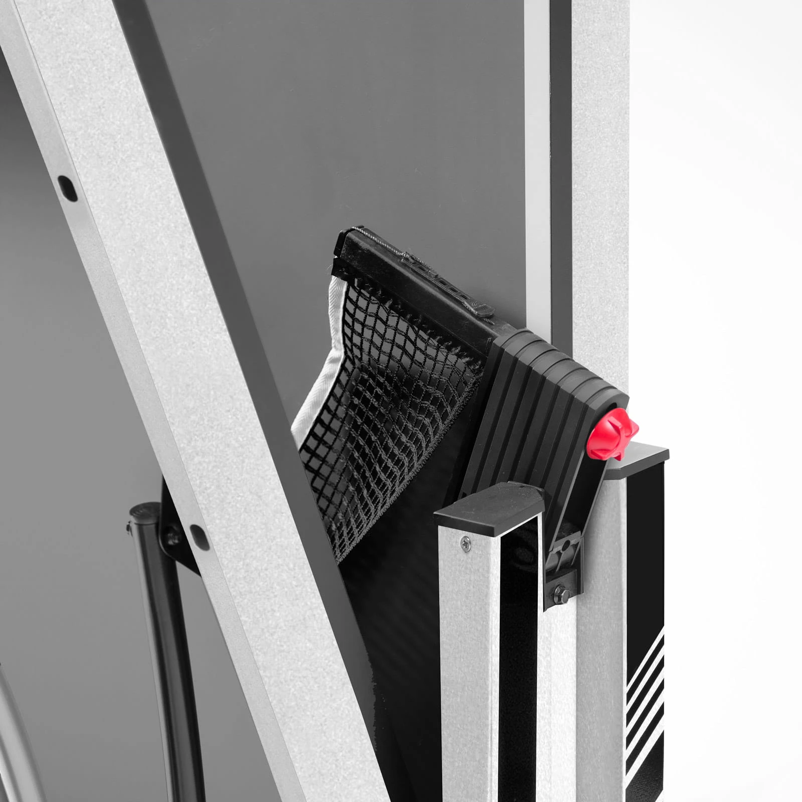 REGULOWANA I SKŁADANA SIATKA: Podwójny system regulacji zapewnia zawsze idealne wyregulowanie siatki - zarówno wysokości, jak i napięcia. Siatka przy zamykaniu stołu automatycznie chowa się pomiędzy blatami, co zapewnia zmniejszenie zajmowanego miejsca i bezpieczeństwo.