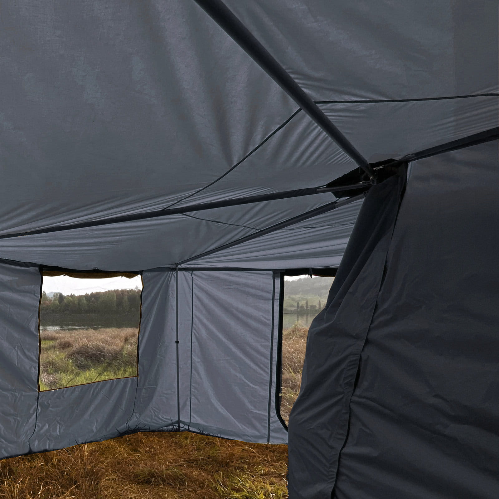 Markiza do samochodu SIDE 2 to świetny sposób na zagospodarowanie przestrzeni wokół samochodu. Markiza rozciąga się wokół samochodu aż na 270, tworząc dużą, zacienioną przestrzeń, gdzie spokojnie odpoczniesz w upalne dni. Bez problemu zmieścisz tam krzesła, stół turystyczny czy lodówkę termiczną. W deszczowy poranek solidna, wodoodporna tkanina (PU 2000 mm) zapewni Ci suchą powierzchnię, gdzie przygotujesz śniadanie.