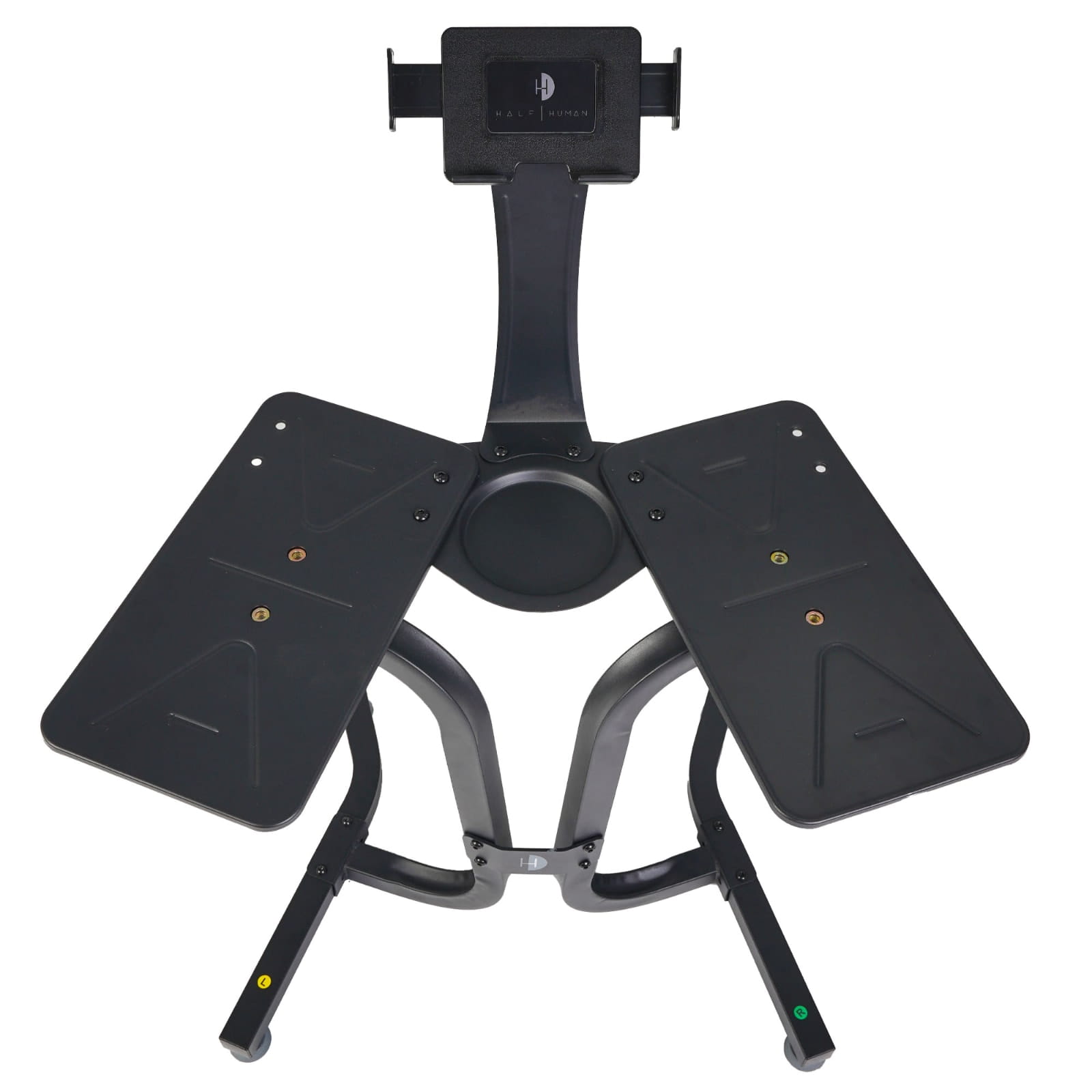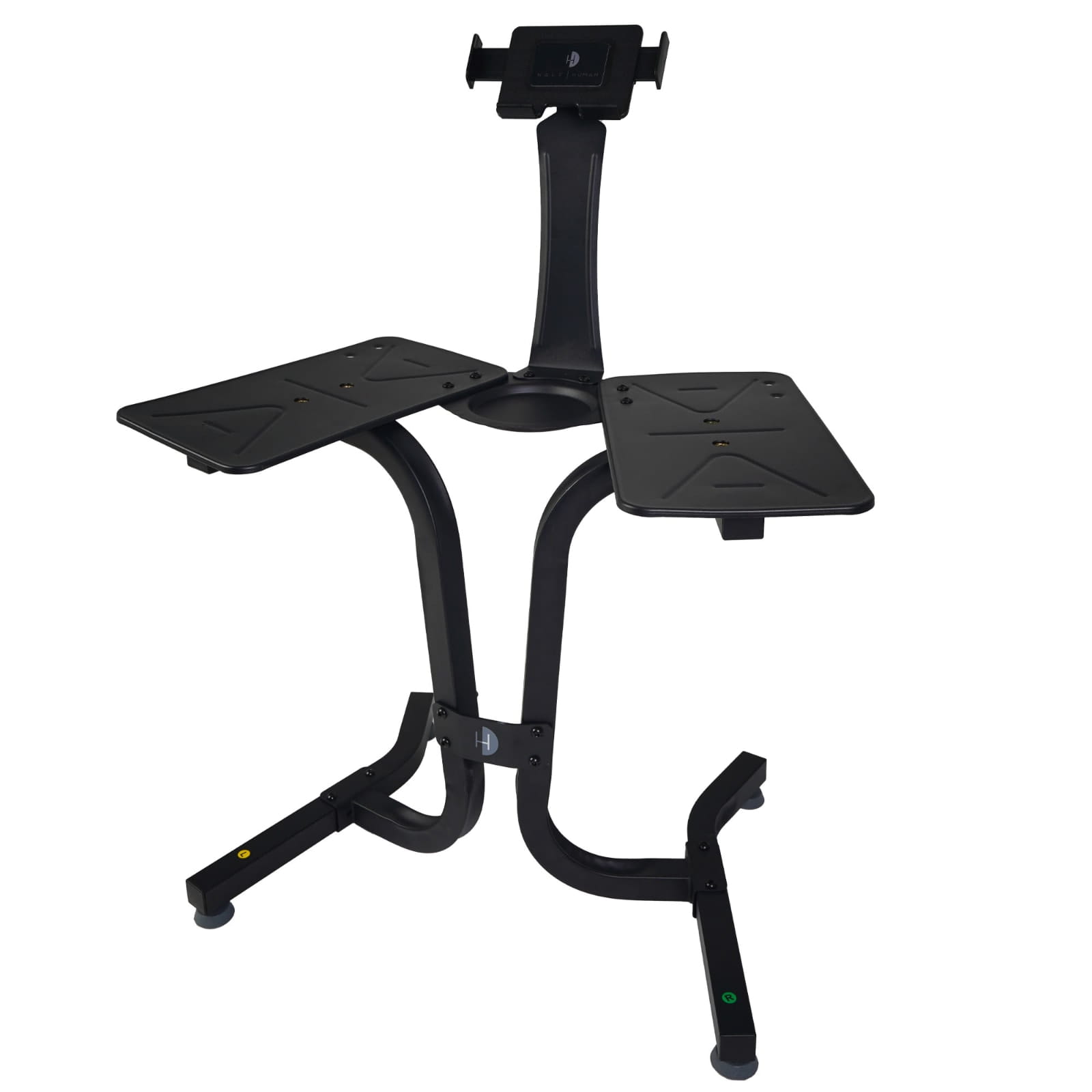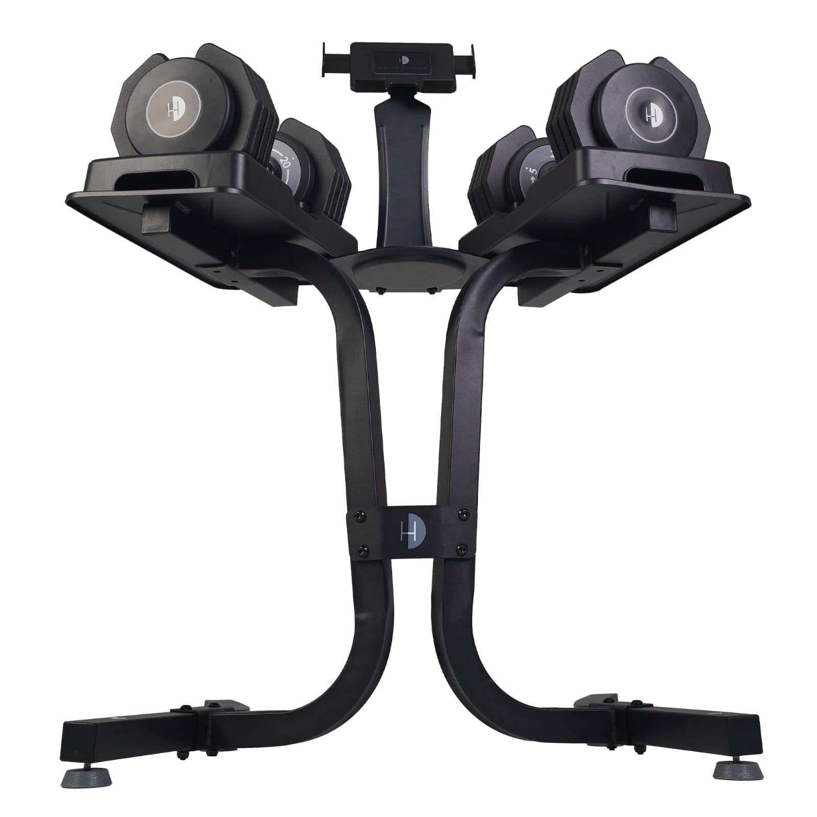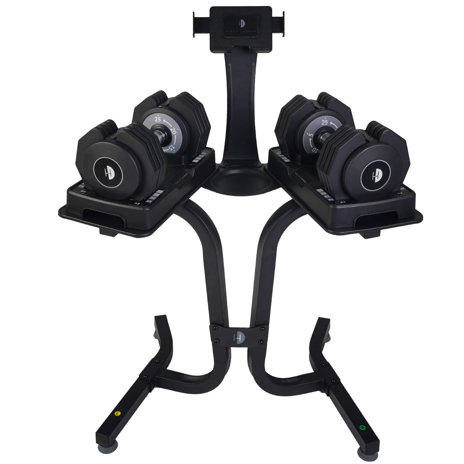 Stojak Half Human nie tylko zwiększa bezpieczeństwo treningu, ale również minimalizuje zajmowaną przestrzeń dzięki wyjątkowo małej podstawie, co pozwala na efektywne przechowywanie hantli nawet w mniejszych pomieszczeniach. Ważący zaledwie 11,8 kg, stojak jest łatwy do przenoszenia, a zintegrowany uchwyt umożliwia wygodne umieszczenie tabletu lub smartfona. Dzięki temu masz dostęp do ulubionych aplikacji treningowych i programów, co pozwala na jeszcze bardziej wszechstronny i wymagający trening siłowy.
