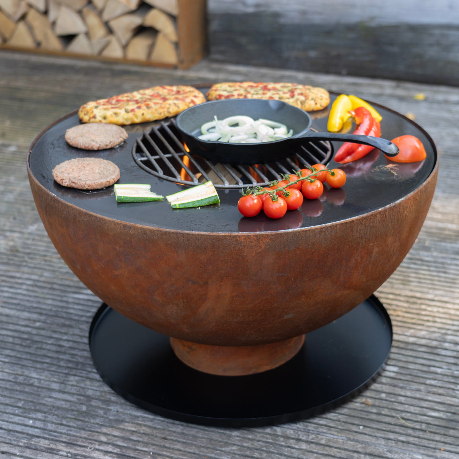 Palenisko ogrodowe Gystad marki HEAT Outdoor Living to funkcjonalne i stylowe rozwiązanie do ogrodu, które pozwala połączyć przyjemność spędzania czasu przy ogniu z możliwością grillowania. Misa o średnicy 60 cm osadzona jest na stabilnej stalowej podstawie, a w zestawie znajduje się stalowa płyta plancha oraz ruszt grillowy o średnicy 30 cm. Takie połączenie daje dużą swobodę w przygotowywaniu potraw bezpośrednio nad płomieniami – od warzyw i mięs po lekkie przekąski.