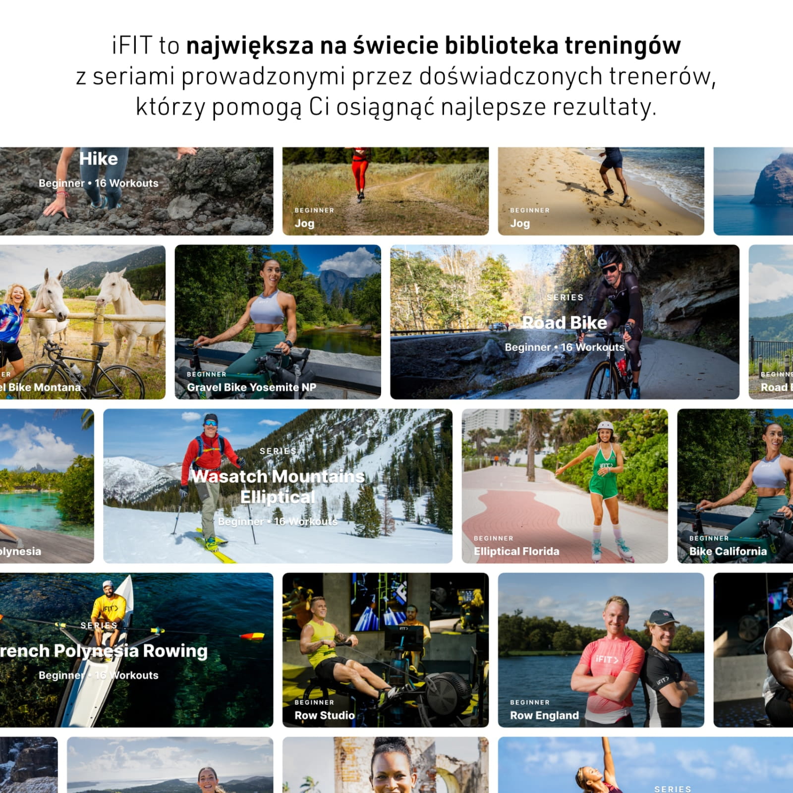Zapewnia dostęp do ponad 11 000 filmów treningowych w jakości HD prowadzonych przez 200 certyfikowanych trenerów z całego świata. Dzięki inteligentnym funkcjom, takim jak automatyczne dostosowywanie prędkości sprzętu oraz nachylenia do wybranego treningu, czy ustalonego tętna użytkownika. Treningi z iFit spełnią oczekiwania każdego użytkownika.