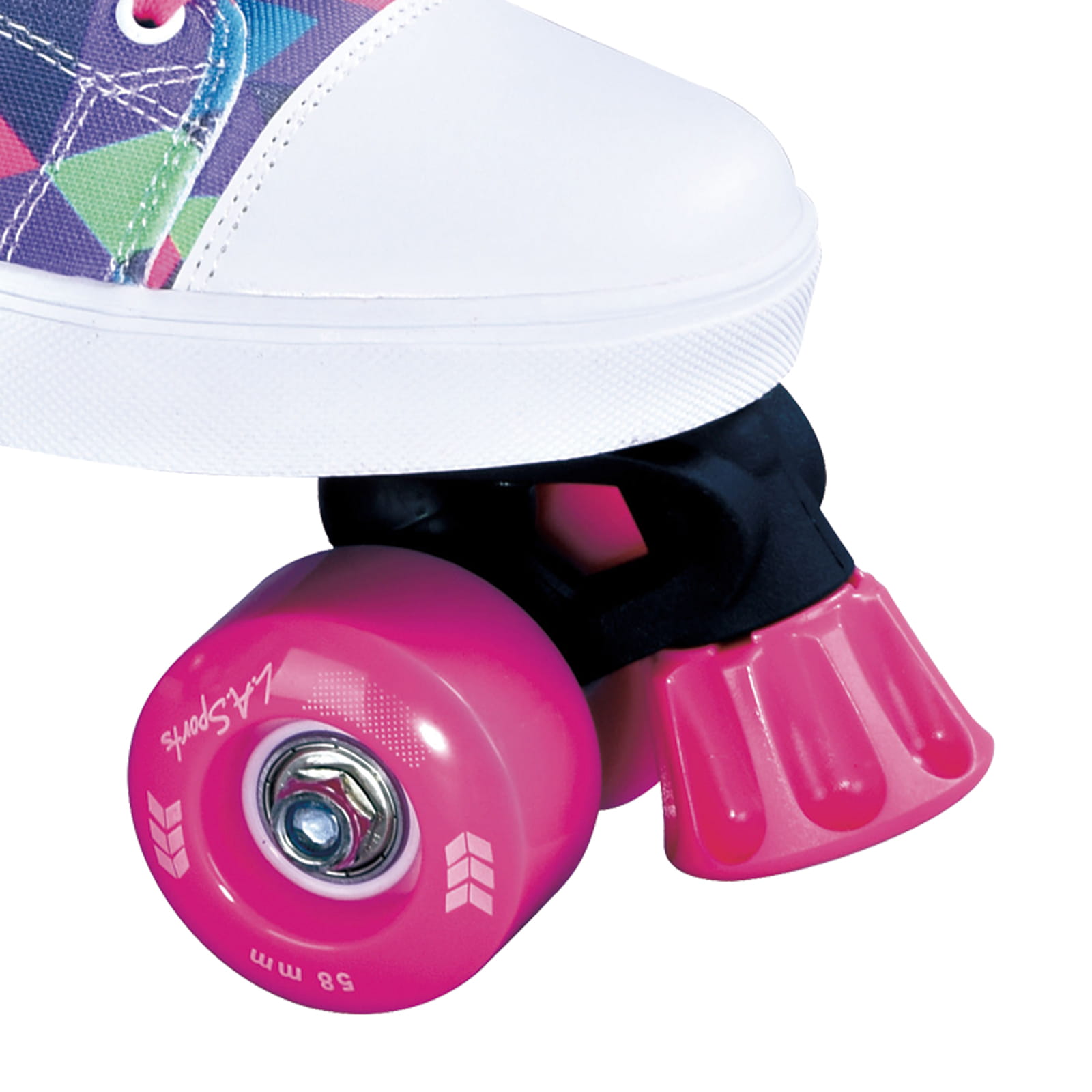 Wygodne i modne wrotki L.A. Sports przeznaczone są do jazdy rekreacyjnej. Wyglądem przypominają kolorowe trampki, a nowoczesny design sprawi, że będą wyróżniały się na tle innych. But wykonany z mocnej płóciennej tkaniny, przepuszcza powietrze. Dzięki temu jeździ się komfortowo nawet w lecie, kiedy temperatura jest wysoka. Sznurowadła sprawiają, że wrotka dobrze dopasowuje się do każdej stopy, co dodaje wygody i zabezpiecza ją przed urazem w razie upadku. Trwała płoza z PP, kółka z PU oraz łożyska ABEC-5 gwarantują płynność jazdy i wytrzymałość wrotek. Przedni hamulec zrobiony jest z PVC. Pętla znajdująca się z tyłu buta ułatwia zakładanie i ściąganie wrotek.