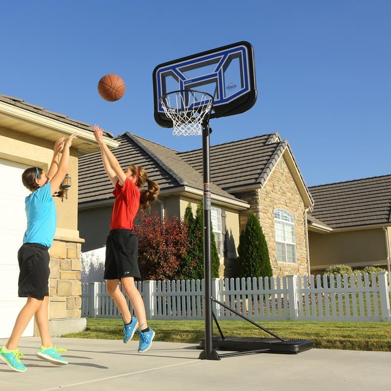 Przenośny stojak do koszykówki posiada 44 calową tablicę wykonaną w technologii Acrylic Fusion™, która gwarantuje wieloletnią trwałość i odporność na uderzenia. Dodatkowo ochrona dolnej krawędzi tablicy oraz teleskopowa regulacji wysokości w zakresie od 228 do 304 cm zapewniają komfortową i bezpieczną grę na każdym poziomie zaawansowania. Całość uzupełnia wytrzymała klasyczna obręcz oraz odporna na warunki atmosferyczne nylonowa siatka i okrągły słup o średnicy 6,9 cm. Rolki transportowe zamontowane w wypełnianej wodą lub piaskiem stabilnej podstawie Streamline o pojemności 45 litrów zapewniają pełną mobilność a zarazem stabilność stojaka