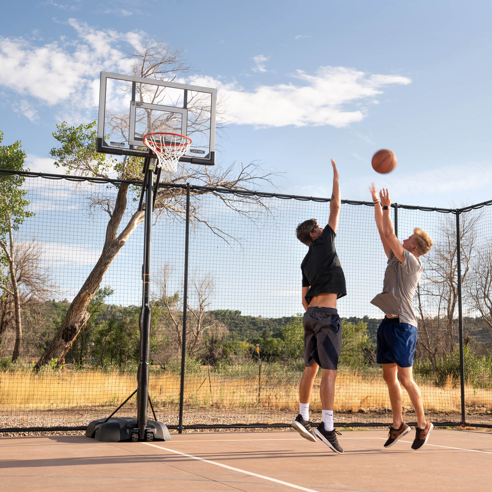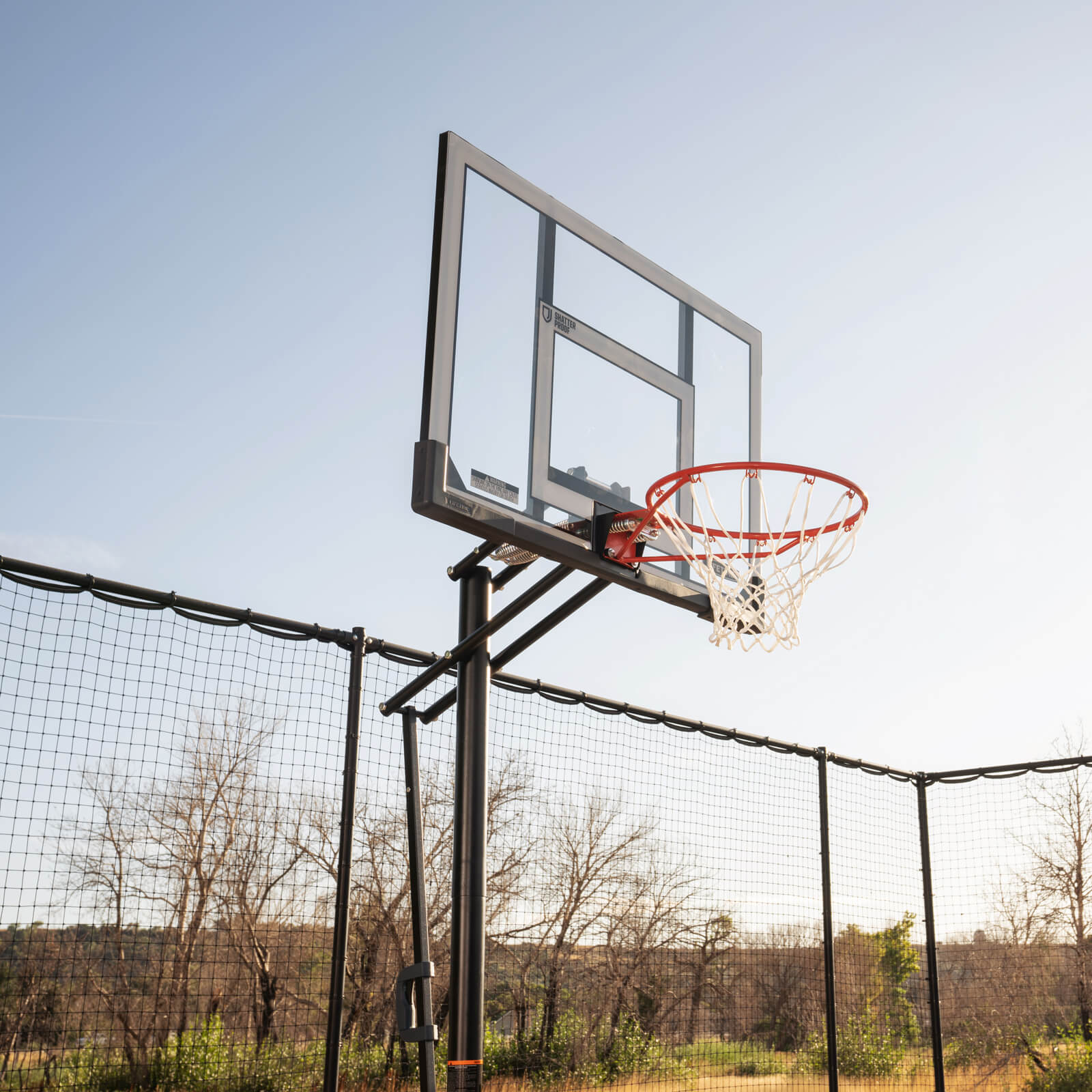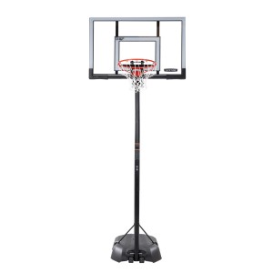 Przenośny stojak do koszykówki posiada 50" tablicę wykonaną w technologii Steel-Framed Shatter-Proof. Technologia Shatter-Proof gwarantuje wieloletnią trwałość i odporność na uderzenia dzięki powłoce z najwyższej jakości poliwęglanu Makrolon®. Steel-Framed to wytrzymała stalowa rama tablicy. Teleskopowa regulacja wysokości tablicy pozwala na szybkie i łatwe ustawienie jej na różnych wysokościach w zakresie od 240 do 300 cm zapewniając komfortową i bezpieczną grę na każdym poziomie zaawansowania. Całość uzupełnia wytrzymała obręcz posiadająca elastyczny, uchylny mechanizm Slam-It® oparty na systemie podwójnych sprężyn oraz odporna na warunki atmosferyczne nylonowa siatka i okrągły słup o średnicy 7,62 cm. Podstawa HDPE o pojemności 128 litrów wypełniana wodą lub piaskiem zapewnia pełną stabilność stojaka. Idealny zestaw dla średniozaawansowanych i zaawansowanych koszykarzy.