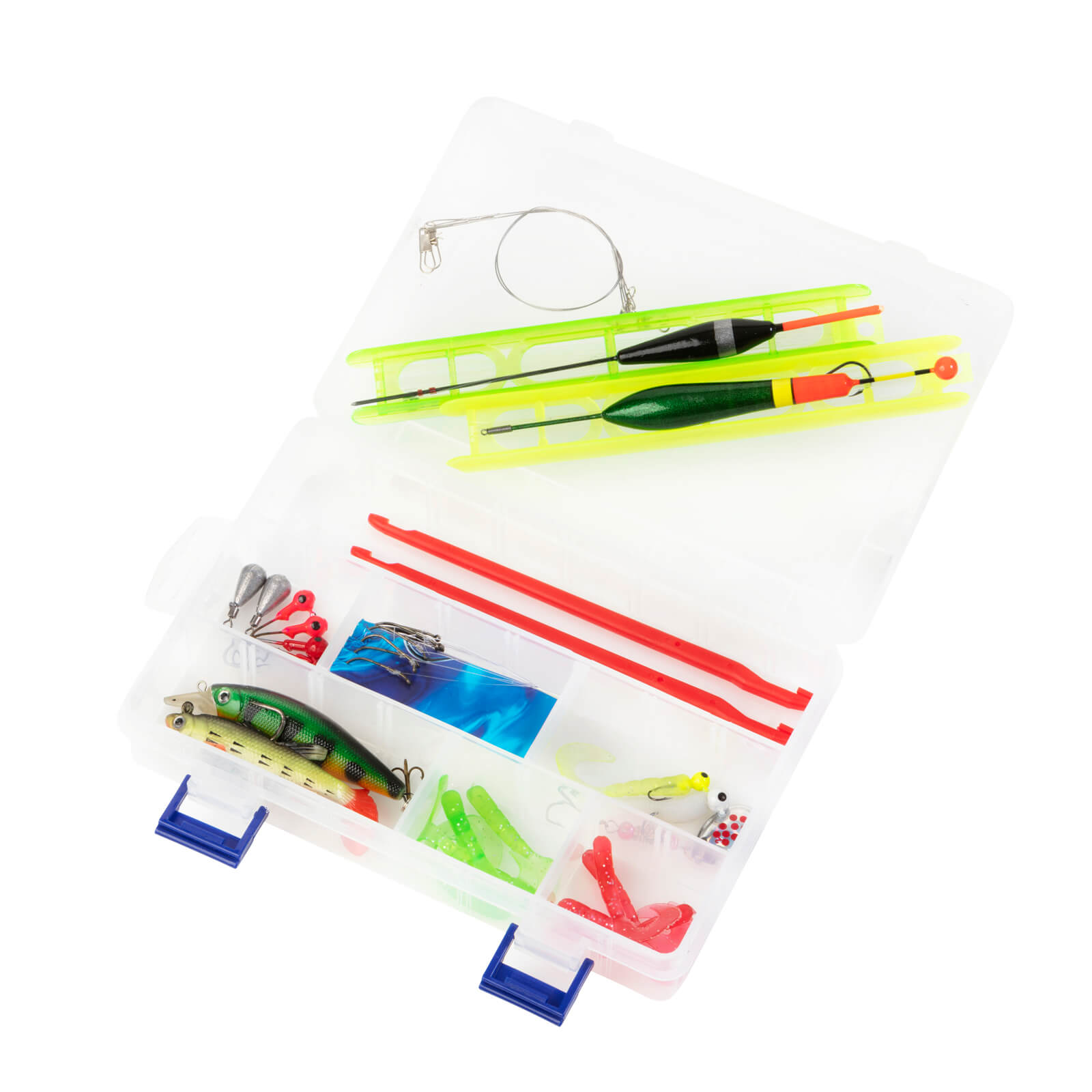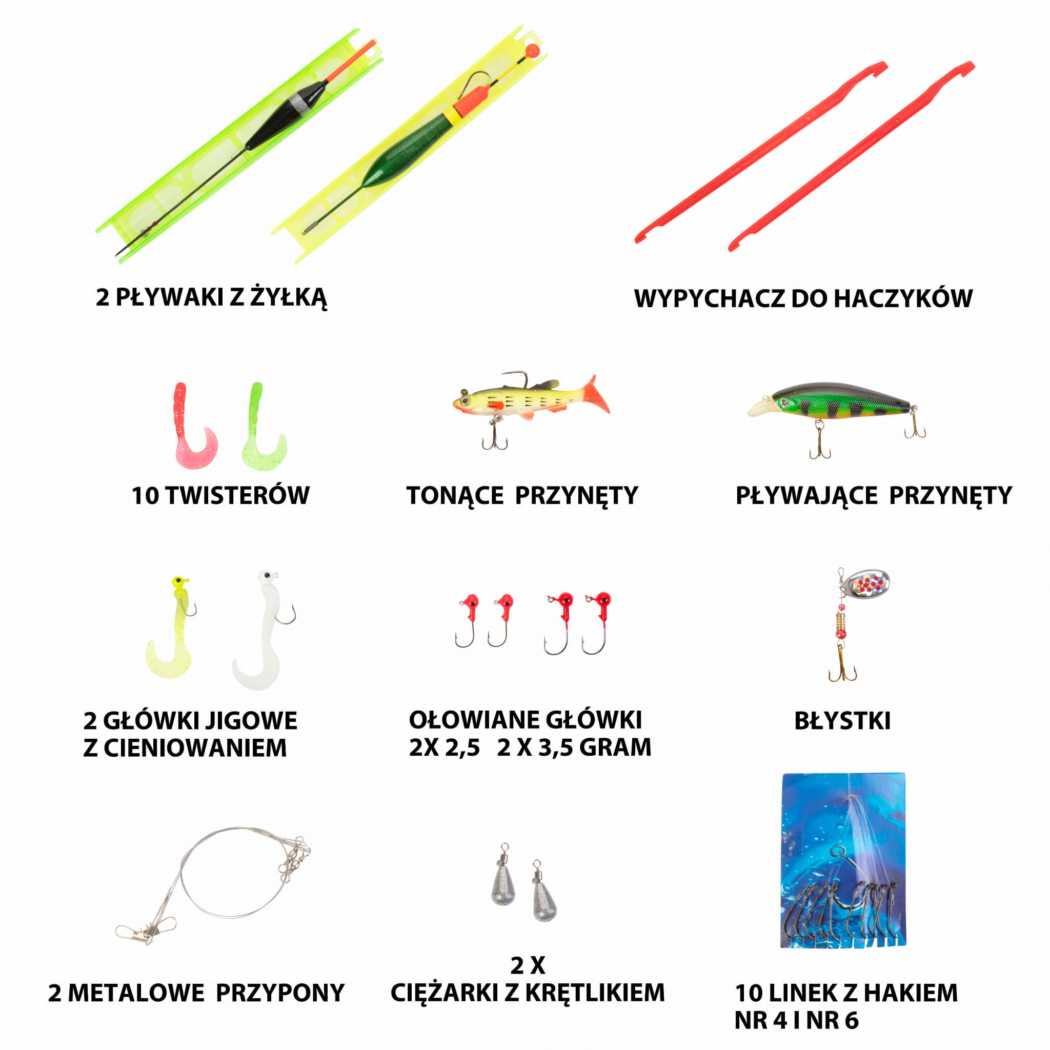 Pudełko z akcesoriami zawiera: pływaki, błyszczki, haczyki, ciężarki, przynęty z haczykami, twistery