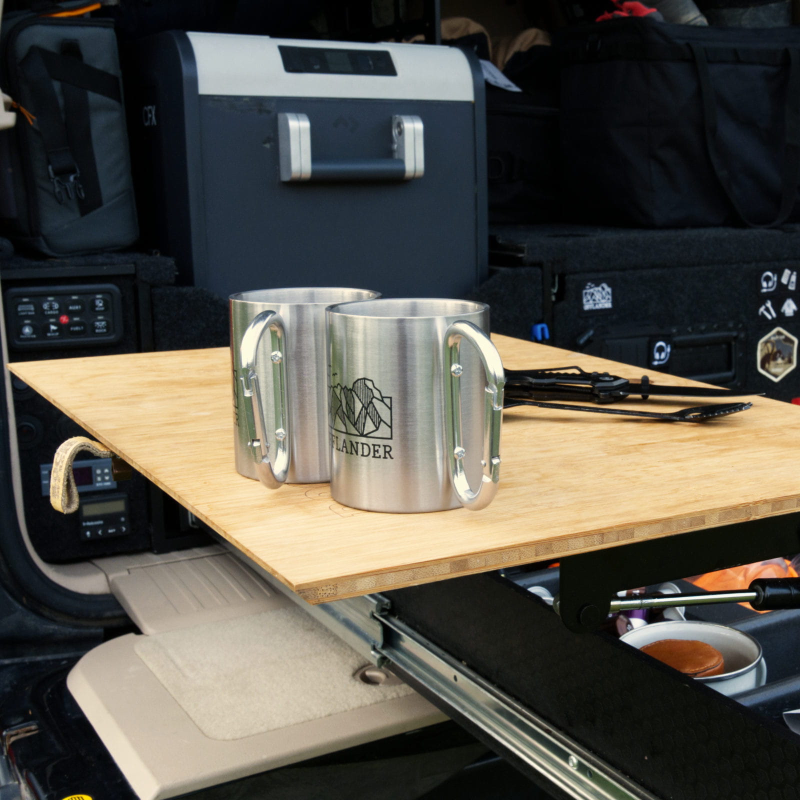 Jesteśmy wyposażeni w wiele takich kubków, które stanowią nieodłączną część naszego ekwipunku podczas każdej wyprawy. Cztery jeżdżą na stałe z tyłu w zabudowie, są niskie, dlatego bez problemu mieszczą się w naszej szufladzie. Bez względu na to, czy jest to krótka przerwa na przydrożnym punkcie, czy dłuższa pauza w malowniczym miejscu, mamy pewność, że nasze kubki są zawsze pod ręką, gotowe na przygotowanie kawy, herbaty czy może czasem czegoś mocniejszego. Mieliśmy wiele różnych droższych rozwiązań, ale prostota i przystępność wygrała.