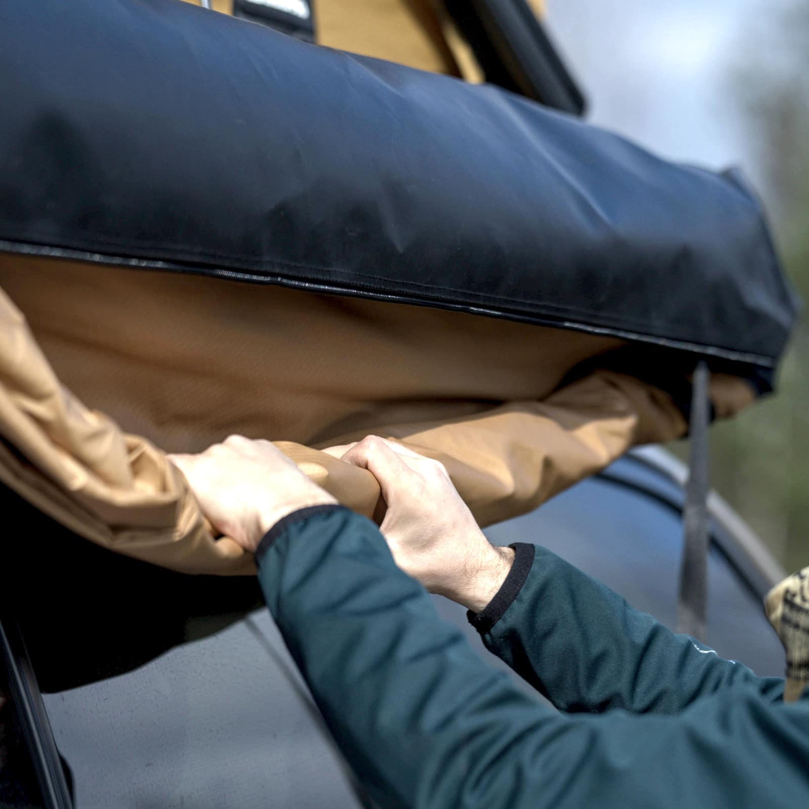 Markiza jest składana i chowana w powiększony pokrowiec wykonany z trwałego PVC, który nie tylko chroni zadaszenie przed uszkodzeniami i zabrudzeniami, ale także ułatwia jego szybkie składanie i chowanie materiału w pokrowiec. Przewidzieliśmy dodatkowe miejsce wewnątrz pokrowca na słupki i mniejsze tarpy lub ściankę UNIWALL od OFFLANDER. Wszystko zmieści się bez problemu w pokrowcu. Luźniejszy materiał PVC nie hałasuje podczas podróży a na pewno ułatwia pakowanie.