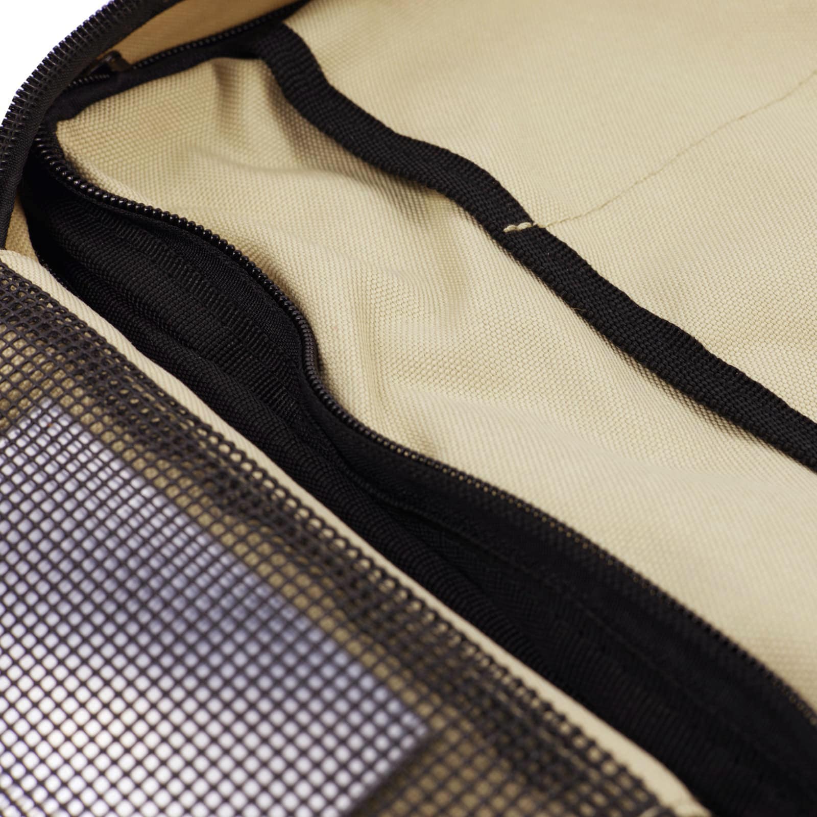 Wewnątrz organizera znajdują się dwie główne kieszenie. Obie zamykane na zamek błyskawiczny, który pozwoli na zabezpieczenie odpowiednio tego co jest w środku. Przednia większa kieszeń wykonana jest z grubej siatki o strukturze gumy. Rozwiązanie bardzo praktyczne i przejrzyste dla użytkownika, tutaj zapewne schowany buteleczki i inne zamykane przedmioty.
