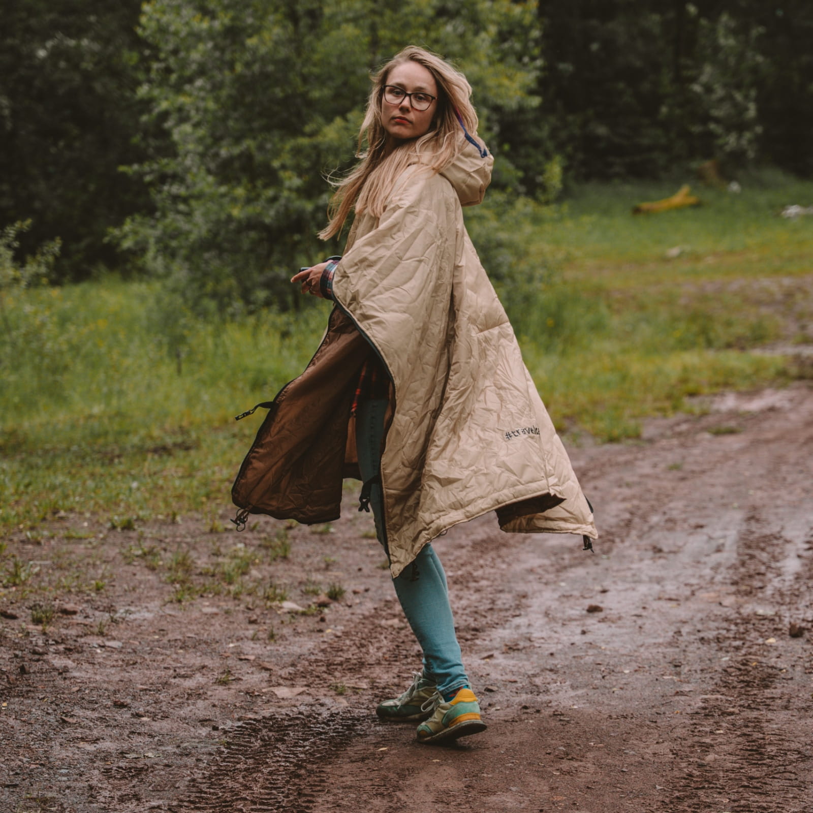 Postawiliśmy na cienką, lekką konstrukcję z wytrzymałego nylonu i syntetycznego wypełnienia, dzięki czemu ponczo świetnie sprawdza się jako alternatywa dla kurtki – narzucisz je na inne warstwy, zyskując swobodę i dodatkową ochronę przed wiatrem.