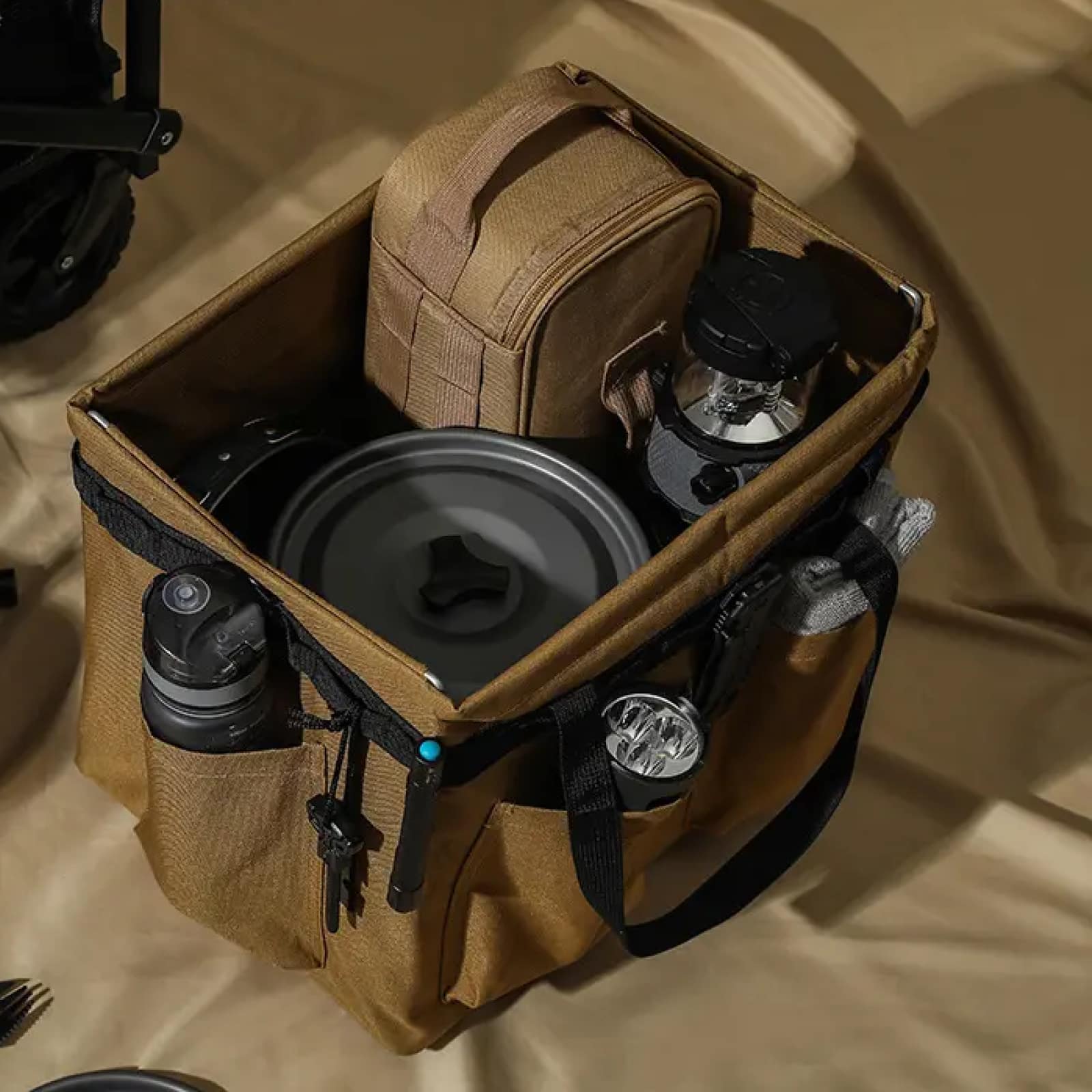 Torba wyposażona jest w pasek MOLLE wokół górnej części, co pozwala na łatwe przypinanie dodatkowych saszetek, wieszaków na akcesoria lub zawieszanie różnych przedmiotów. Posiada dwie klamry D Ring, które pozwalają na noszeniu torby na pasku przez ramię lub zawieszeniu nad ziemią. Torba została wzmocniona została metalowym stelażem, co nadaje jej kształt idealnego prostopadłościanu. Po złożeniu stelaża, można ją ułożyć prawie na płasko, co ułatwia jej przechowywanie, nawet w niewielkich przestrzeniach, takich jak załadowany samochód.