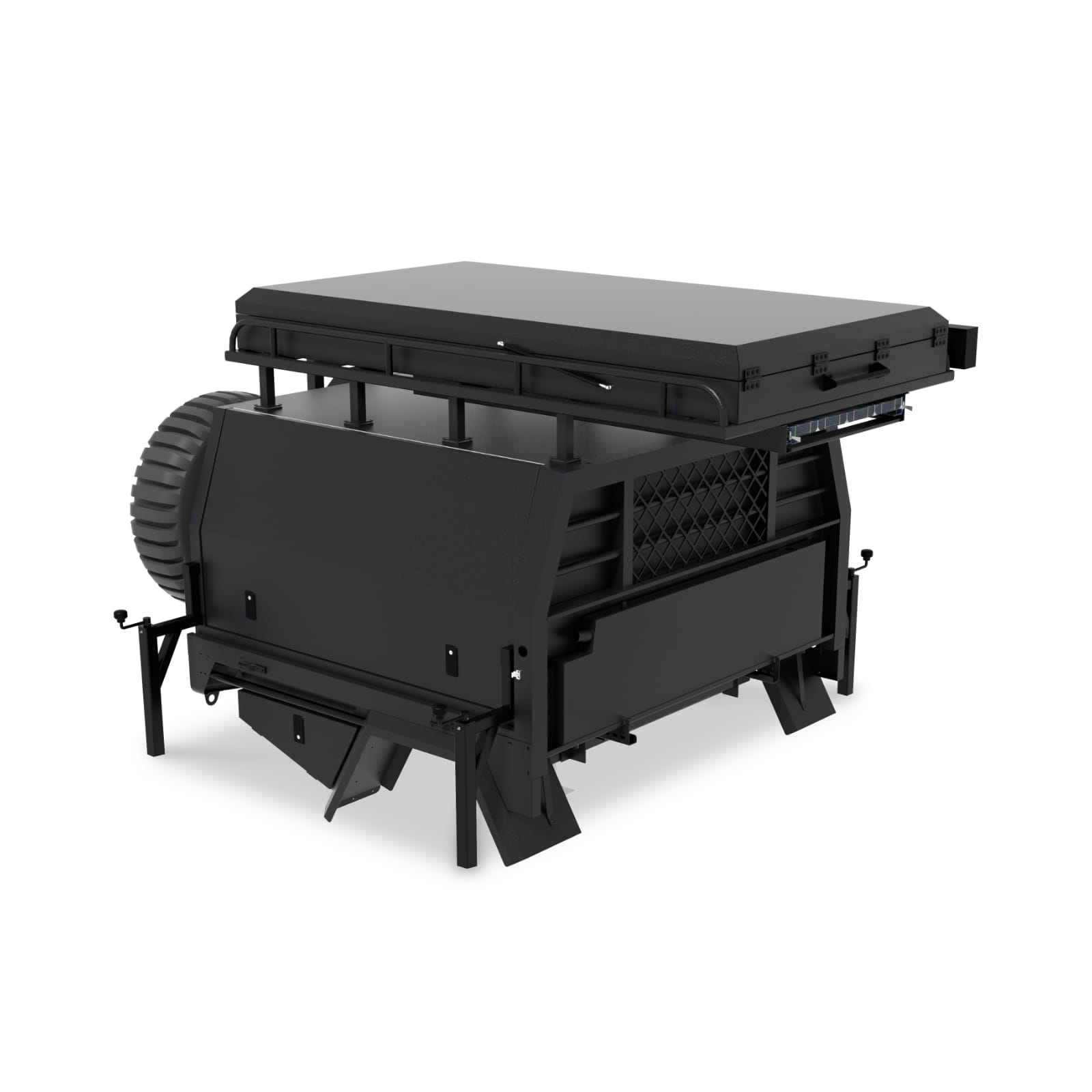 W skład Darbat wchodzi aluminiowa platforma typu flat tray o wymiarach 173 × 188 cm oraz dopasowana kapsuła canopy o wymiarach 165 × 180 × 86 cm. Takie połączenie pozwala na pełne wykorzystanie przestrzeni ładunkowej pojazdu, a jednocześnie stanowi stabilną i funkcjonalną bazę do dalszej rozbudowy – od prostych schowków po zaawansowane moduły wyprawowe.
