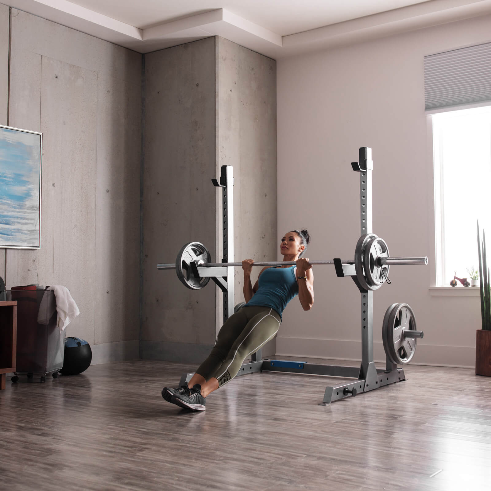 Uchwyty na sztangę możesz ustawić na dogodnej dla siebie wysokości, w zależności od Twojego wzrostu i ćwiczeń, jakie chcesz wykonać. Umożliwiają to haki asekuracyjne, które możesz swobodnie regulować. Regulacja pozwala Ci dopasować wysokość sztangi oraz jej odległość od ławki sprawiając, że staje się jeszcze bardziej uniwersalna. Dodatkowo stojak wyposażony jest w dwa uchwyty na obciążenia, które pozwolą Ci utrzymać w domowej siłowni ład i porządek. Na stojaku znajdują się także uchwyty na gumy treningowe.