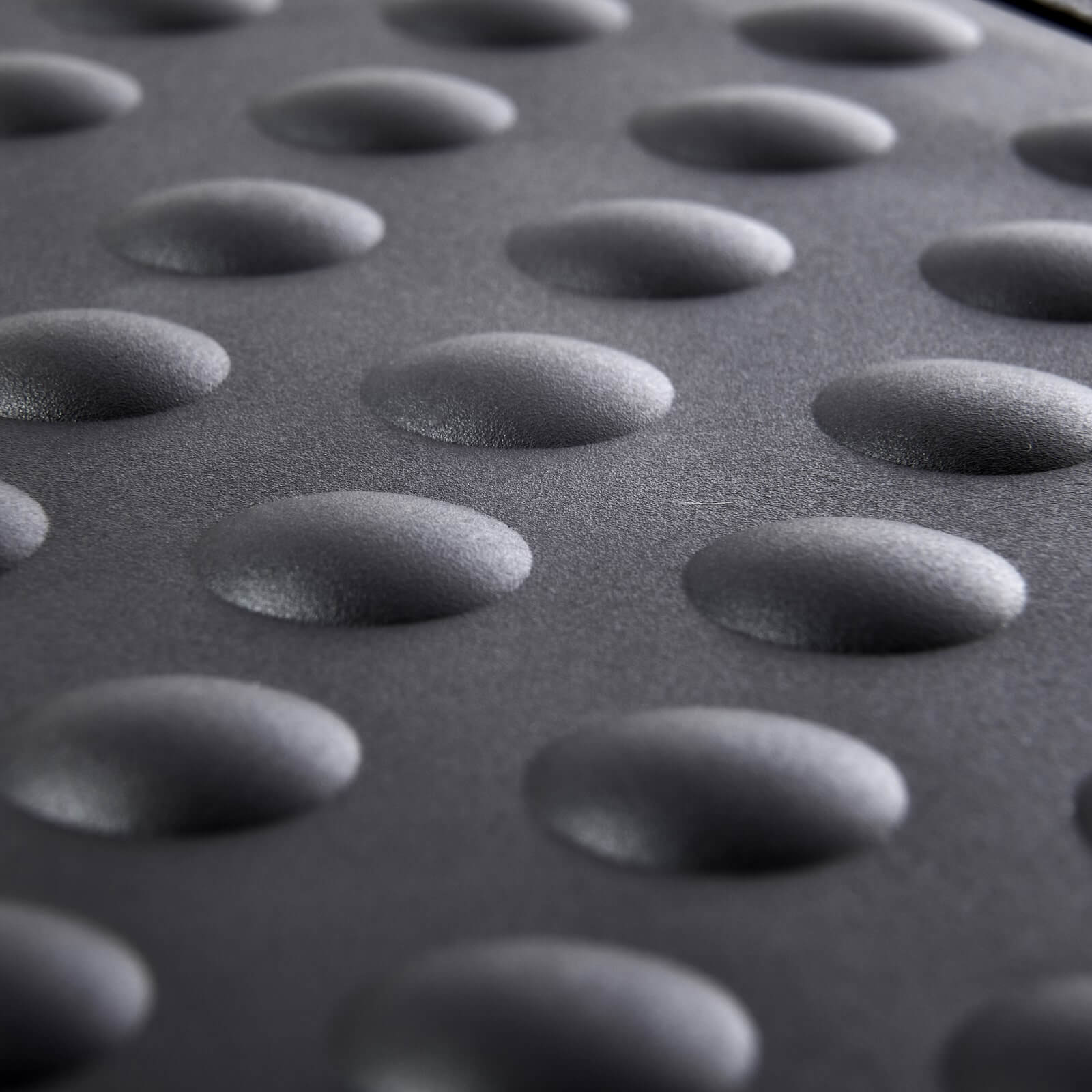 Powierzchnia stepu jest gumowa, pokryta wypustkami, aby ręce i nogi nie ślizgały się podczas męczących treningów. Dzięki temu możesz bezpiecznie i stabilnie skupić się na wykonywanym ruchu. Jeżeli chcesz zwiększyć intensywność ćwiczeń, możesz urozmaicić trening, zaczepiając linkę oporową o otwory umieszczone na spodzie stepu. Za jej pomocą zmusisz mięśnie do mocniejszej pracy i osiągniesz jeszcze lepsze efekty.