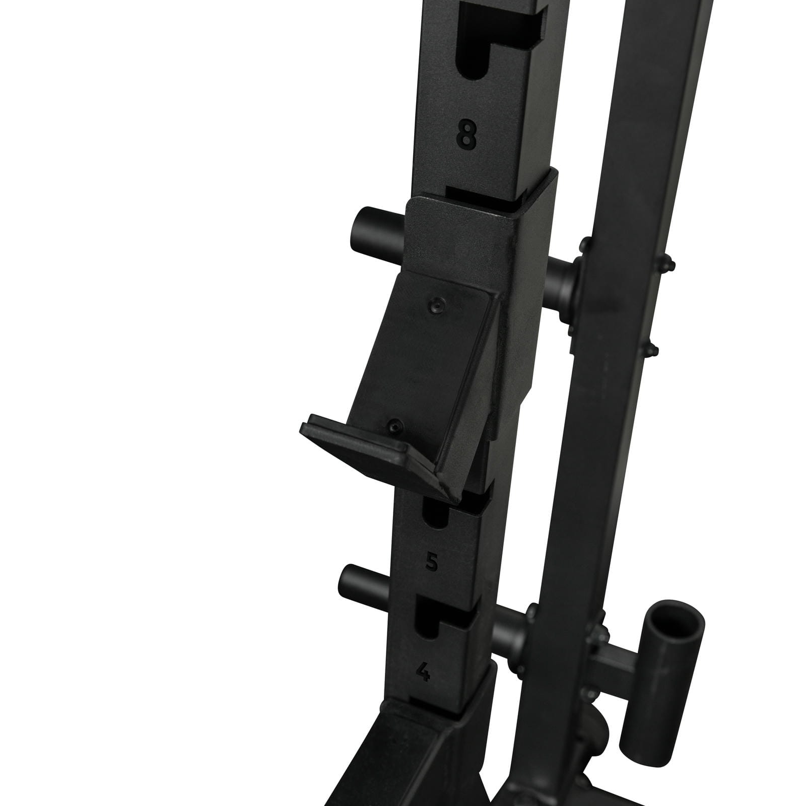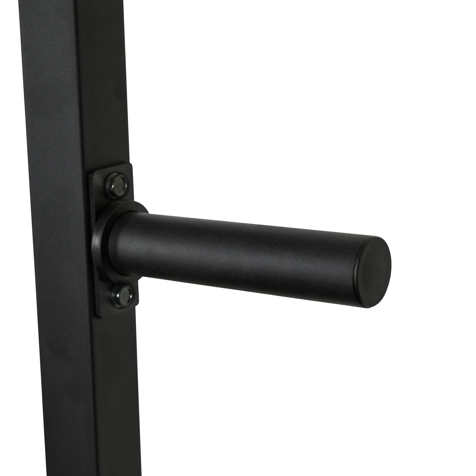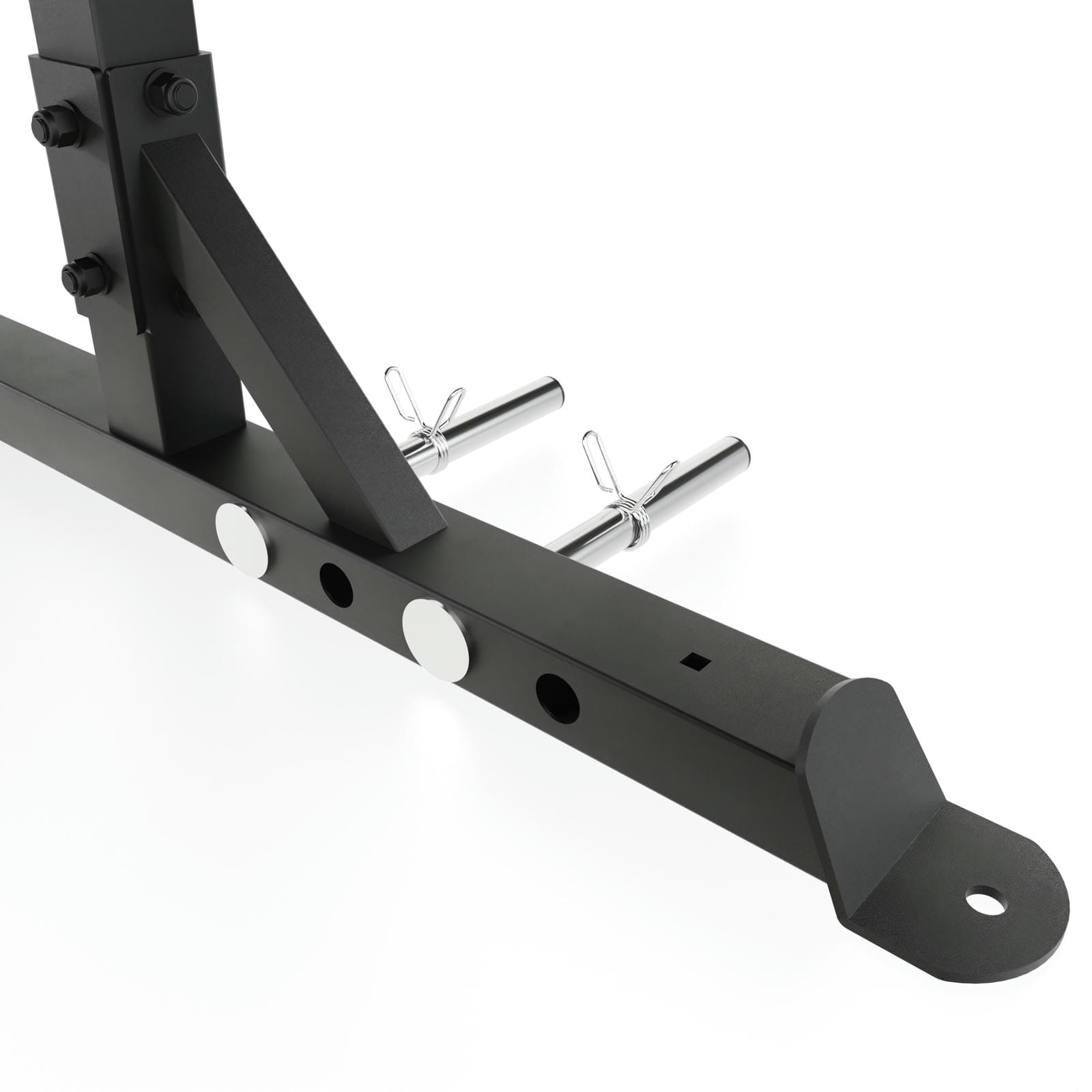 Model HR100 został wyposażony w drążek do podciągania z wieloma wariantami chwytu, który umożliwia trening górnych partii ciała. Po bokach znajdują się uchwyty na talerze olimpijskie, co pozwala utrzymać porządek w strefie treningowej i szybciej zmieniać obciążenie. Dolne belki konstrukcji umożliwiają mocowanie gum oporowych, co zwiększa możliwości treningowe i urozmaica ćwiczenia.