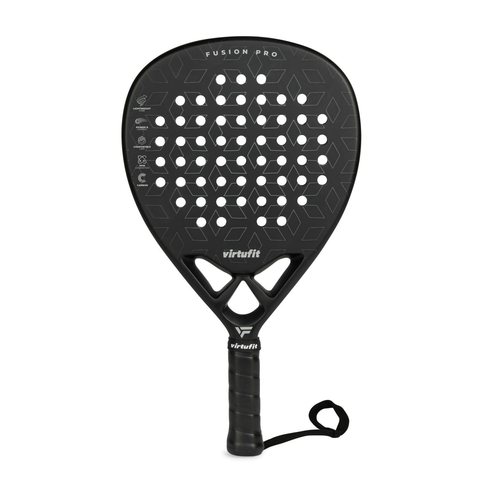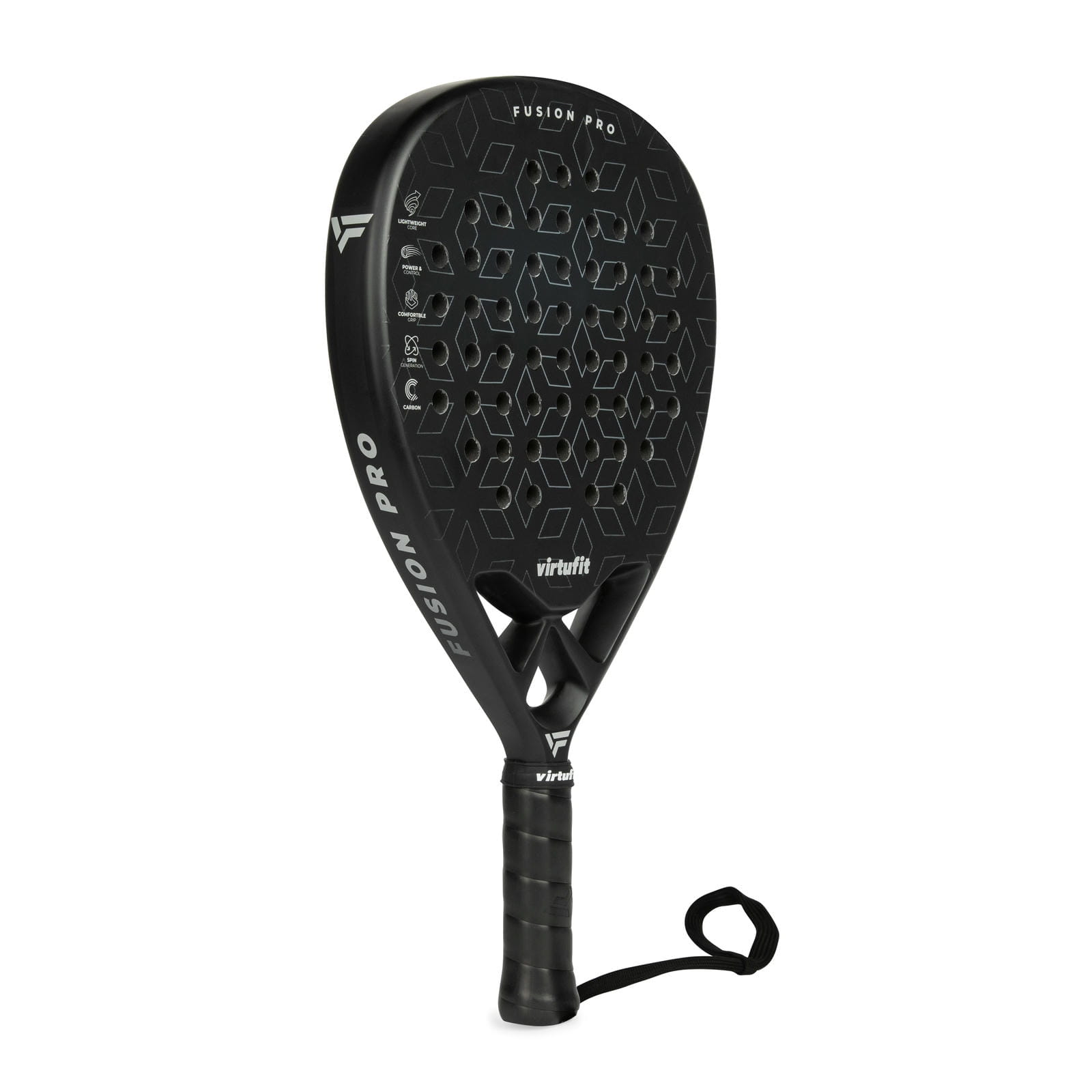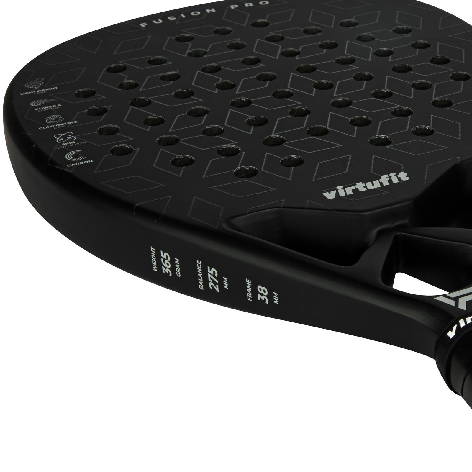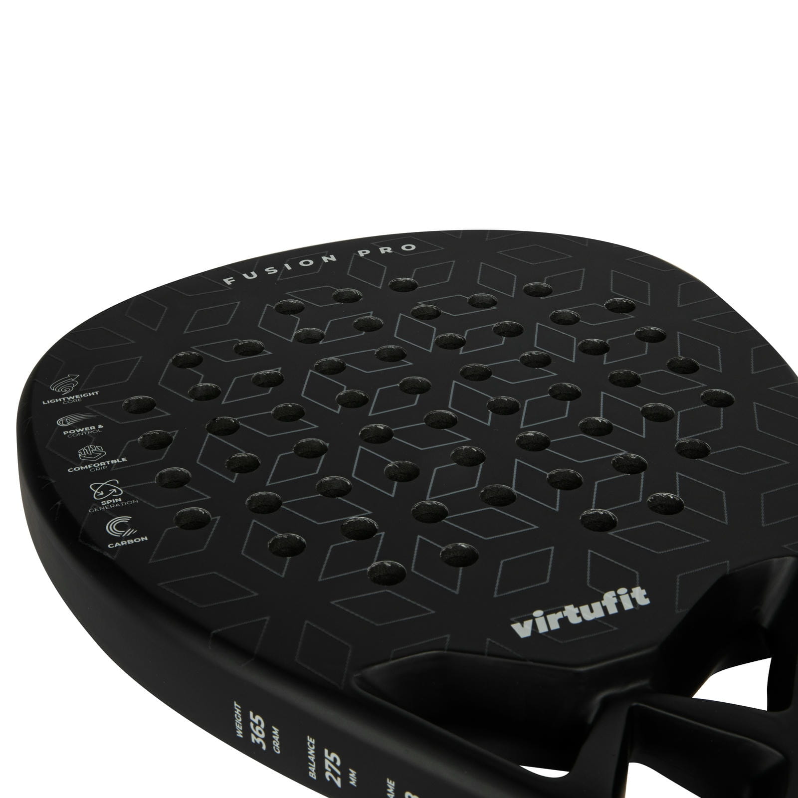 Rakieta VirtuFit Fusion Pro została stworzona dla graczy, którzy chcą połączyć siłę z precyzją. Dzięki centralnemu i lekko podwyższonemu punktowi równowagi ułatwia wykonywanie mocnych, ofensywnych uderzeń, a jednocześnie zapewnia kontrolę w grze przy siatce. Ostrze w kształcie kropli oferuje dodatkową moc i manewrowość, choć wymaga większej precyzji niż rakiety o okrągłym kształcie. Fusion Pro waży 365 g, posiada ramę o grubości 38 mm, twardy rdzeń z pianki EVA i ostrze wykonane z 18-karatowego włókna węglowego. Ergonomiczny uchwyt zapewnia pewny chwyt i wygodę nawet podczas dłuższych meczów.